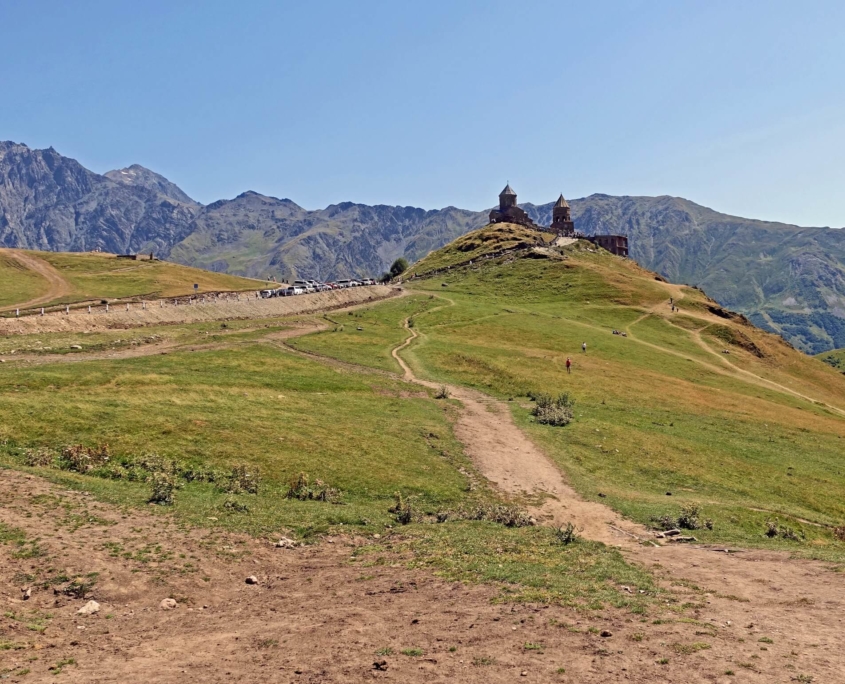 Wędrówka na szczyt Kazbeku rozpoczyna się na wysokości 2 170 m przy słynnym klasztorze Cminda Sameba (Święta Trójca). Ten XIV-wieczny kościółek jest jedną ze sztandarowych wizytówek Gruzji, do której każdego roku przybywają tysiące turystów. Ruszamy wśród soczyście zielonych pagórków szlakiem do góry. To ostatni dzień, kiedy możemy nacieszyć oczy kolorami, zanim na kilka kolejnych dni zamieszkamy w krainie lodu i skały. Droga wiedzie łagodnie pod górę ewidentną, wydeptaną ścieżką.
