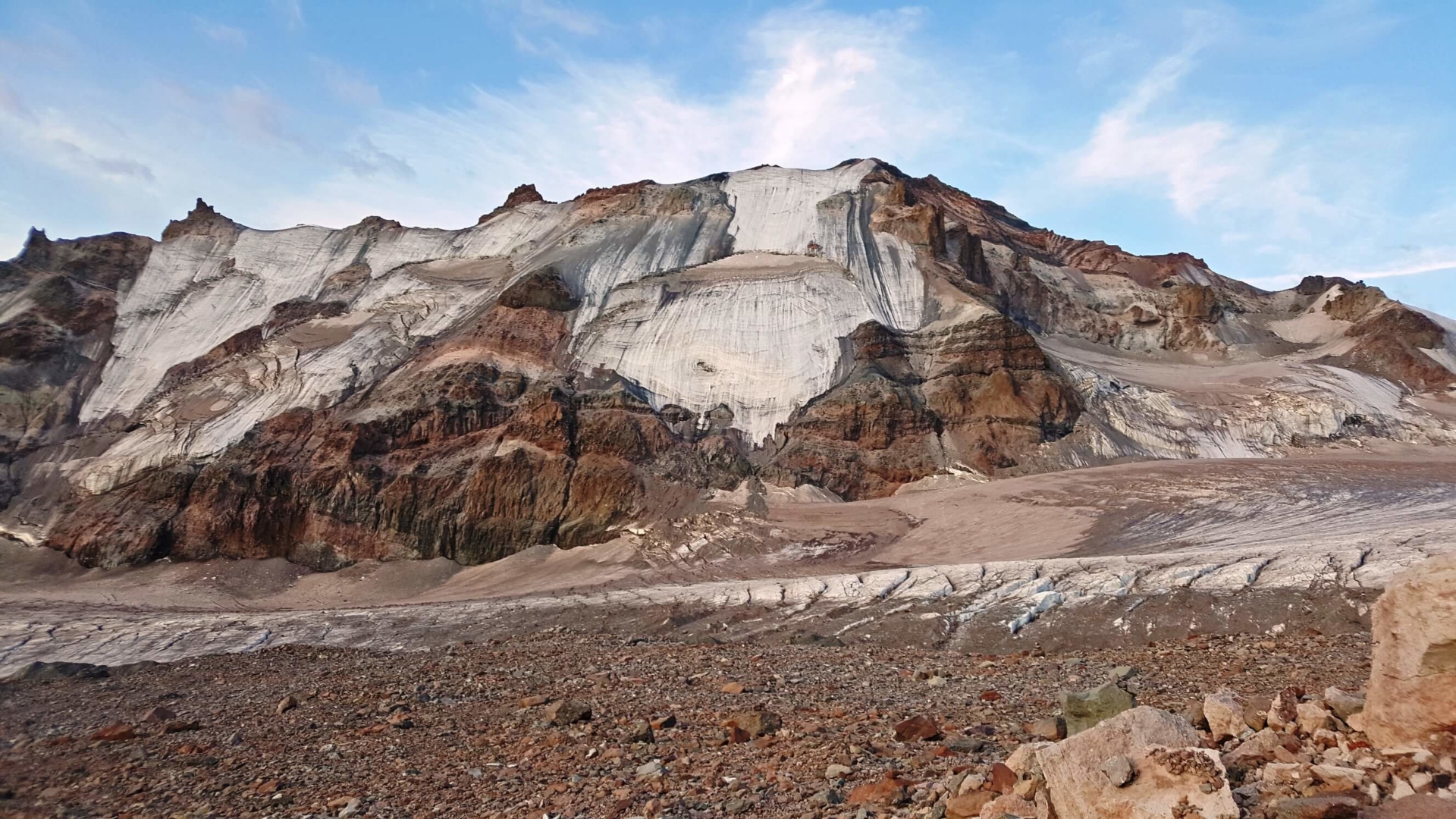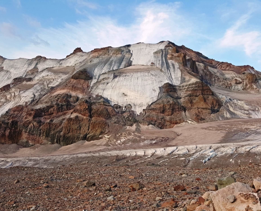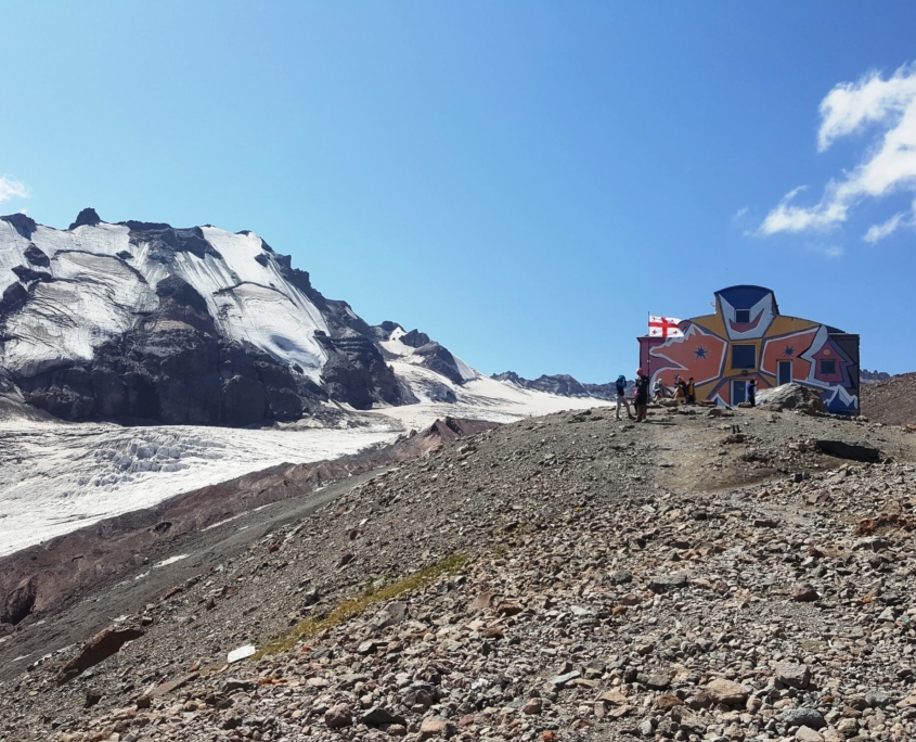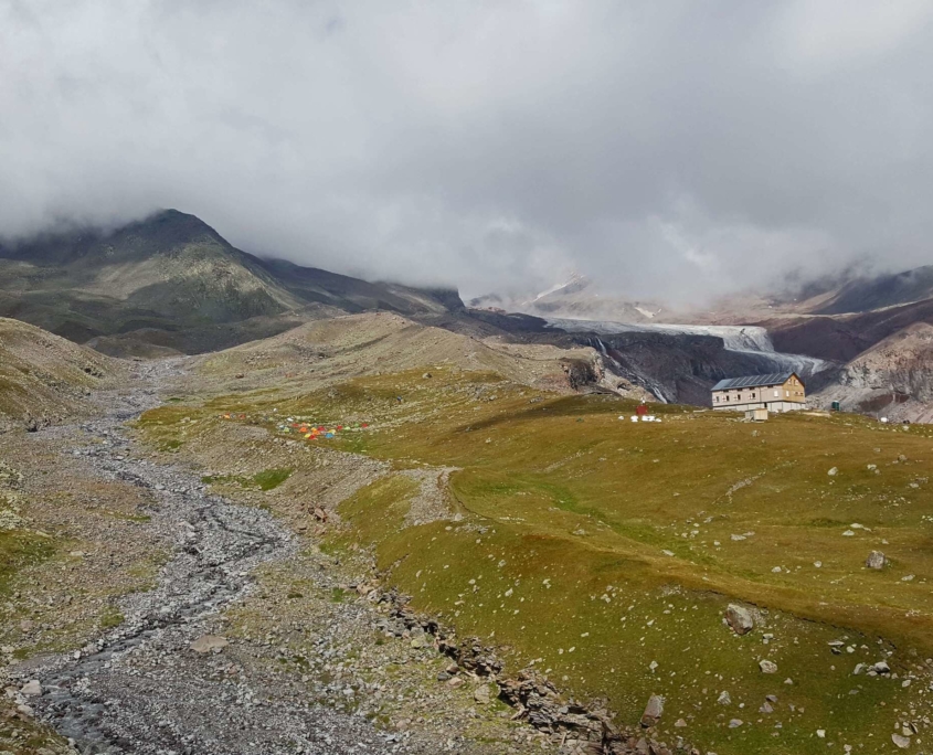 Celem kolejnego dnia wyprawy jest dotarcie do bazy przy Stacji Meteo (Betlemi Hut) na wysokości 3 653 m. To miejsce stanie się na kilka najbliższych dni naszym domem i punktem wypadowym akcji górskich. Po ok. 2 godzinach podejścia kamienistą moreną dochodzimy do początku lodowca Gergeti. Sam lodowiec jest całkiem przyjemny do pochodzenia, nie ma na nim zbyt wielu szczelin, przez które trzeba przeskakiwać. Ostatni fragment podejścia do Stacji Meteo wiedzie za to dość stromym, piarżystym terenem, którego pokonanie zajmuje około 20 minut.
