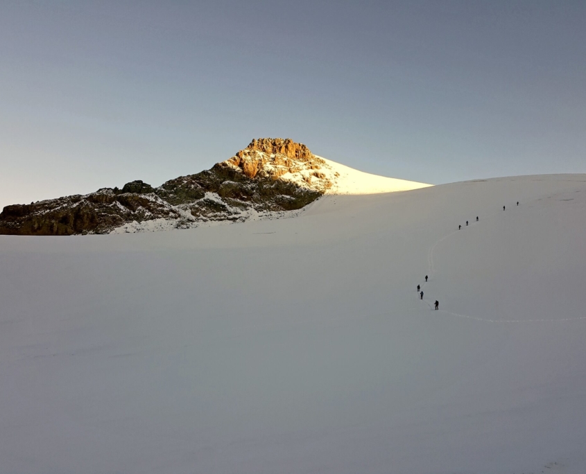 Lodowiec jest porządnie zmrożony i przyjemnie się po nim idzie, choć przez niektóre szczeliny trzeba dość energicznie przeskakiwać. Na plateau dochodzimy około 7:30 i po kilkuminutowej przerwie na uzupełnienie kalorii ruszamy dalej. Idziemy cały czas w cieniu, słońce schowane jest jeszcze po drugiej stronie góry. Wcześniejsze kilka minut bez ruchu wystarcza, żeby zaczęły mi odmarzać dłonie, więc podczas marszu macham nimi energicznie, żeby szybko z powrotem je rozgrzać.