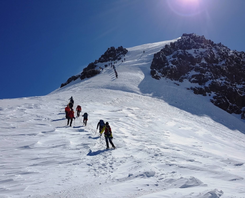 Większość wypraw wybiera na aklimatyzację podejście trasą wejścia na szczyt Kazbeku do wysokości ok. 4 000 m lub wyjście do kapliczki nad Stacją Meteo na wysokości ok. 3 900 m. Naszym celem aklimatyzacyjnym jest szczyt Ortsveri (4 365 m), który wznosi się naprzeciwko Kazbeku. Wejście i zejście zajmuje około 9 godzin, a ostatni etap jest bardzo ciekawym, ale też całkiem męczącym psychicznie czujnym trawersem po osypujących się piargach i latających głazach wielkości telewizorów. Zdecydowanie jednak warto się pomęczyć. Ze szczytu rozpościera się przepiękny widok na cały Kaukaz.