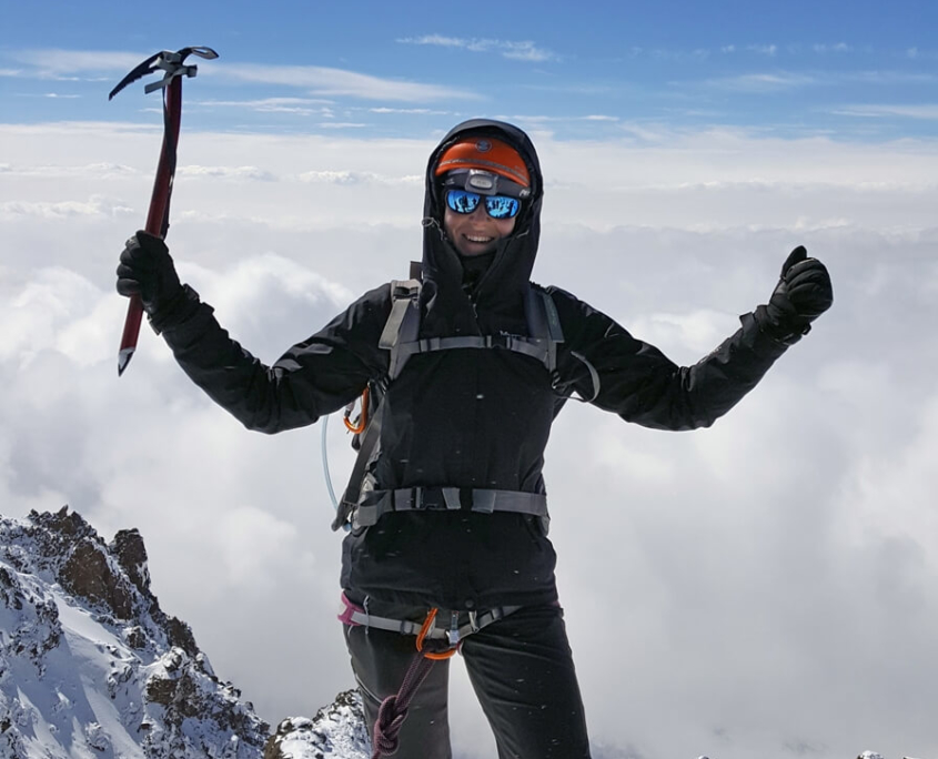Na samym finiszu czeka nas jeszcze bardzo strome podejście kilkudziesięciometrową lodową ścianą. Z miejsca, które z dołu wydawało się szczytem, okazuje się, że jednak jeszcze trzeba przedreptać kilkanaście metrów i… chwilę po godzinie 11 nareszcie stajemy na szczycie! Spędzamy tutaj ok. 10-15 minut. Kilka pamiątkowych zdjęć, filmików i czas wracać. Im niżej, tym pogoda robi się coraz gorsza. Do plateau schodzimy w gęstej mgle, ledwo widać, gdzie kończy się śnieżne zbocze a zaczyna niebo.