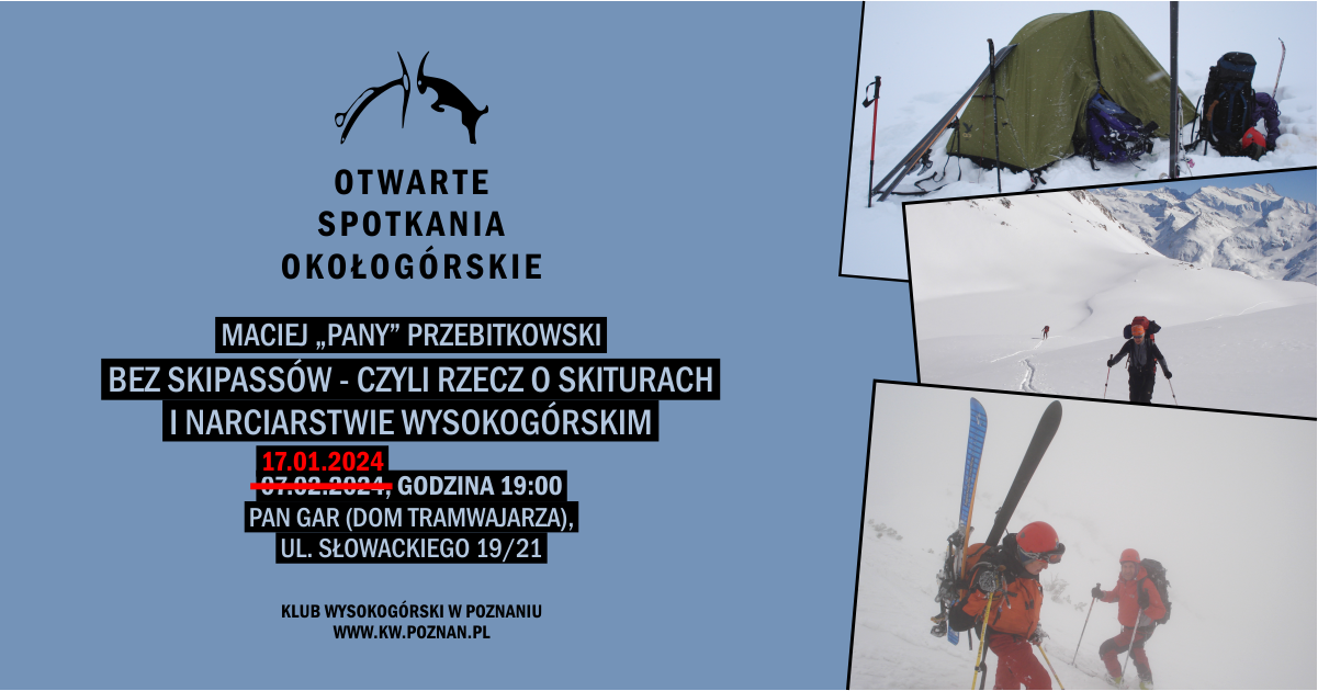 Klub Wysokogórski w Poznaniu ma przyjemność zaprosić Was na ósme spotkanie z cyklu OS-ów: Otwartych Spotkań Okołogórskich. Wypatrujemy powoli śniegu i sezonu zimowego, więc tym razem posłuchamy prelekcji Panego zatytułowanej „Bez skipassów – czyli rzecz o skiturach i narciarstwie wysokogórskim”.